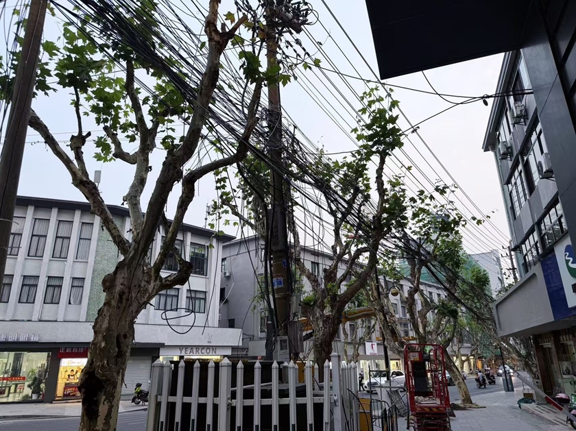 一條衣錦街,半部吳越史。衣錦街不僅承載著吳越文化的深厚底蘊(yùn),更見證了千年古城臨安的變遷與發(fā)展。由于既有地下管道均已飽和,街道南北兩側(cè)的通信管網(wǎng)只能利用桿路架空線的方式進(jìn)行布放,密密麻麻的纜線就像“蜘蛛網(wǎng)”籠罩在半空,既影響美觀,也存在安全隱患。